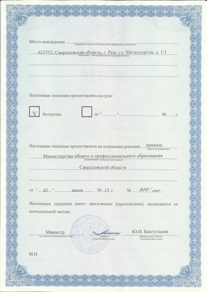 • Места осуществления образовательной деятельности по основным программам профессионального обучения: 623752, Свердловская область, город Реж, ул. Металлургов 1/1